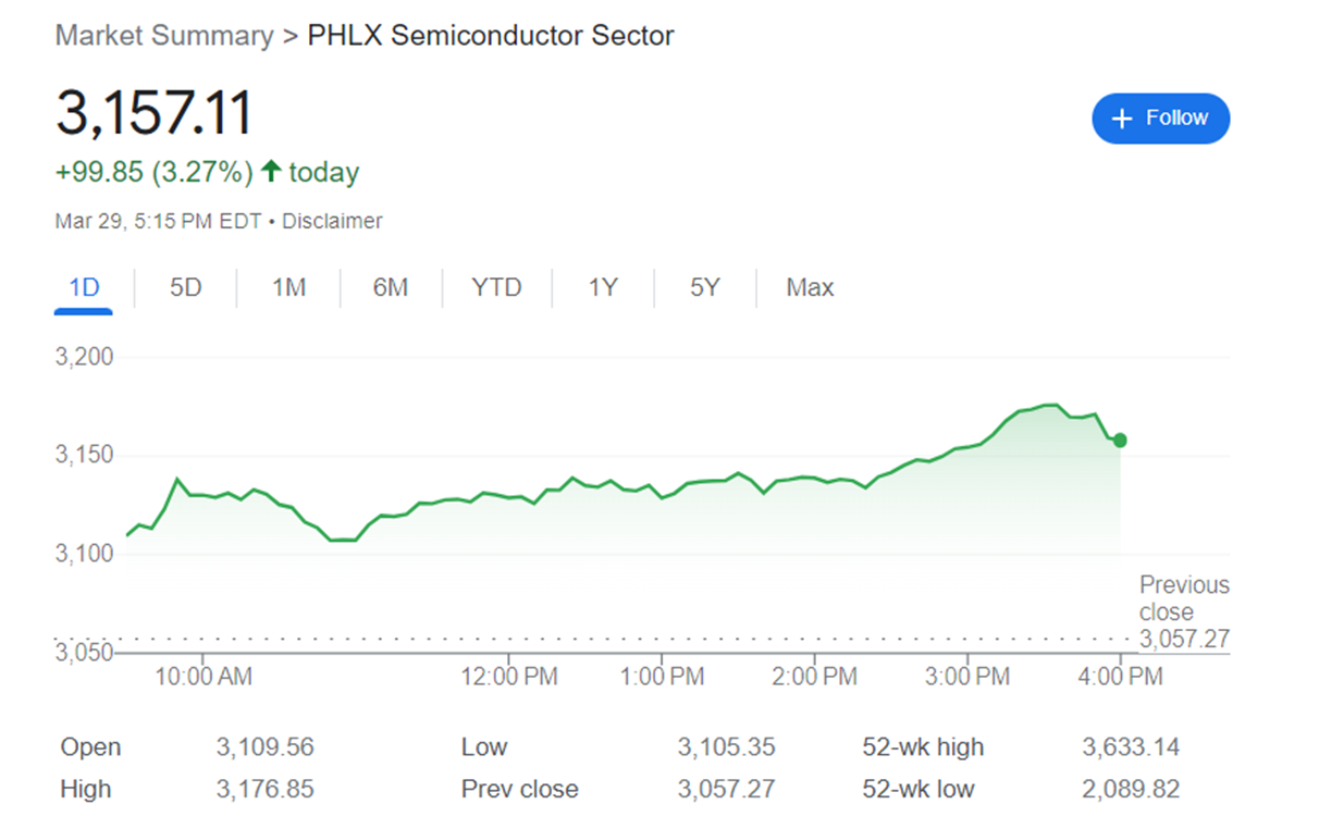 风景不仅A股独好,昨夜(当地时间3月29日)美股半导体多股同样走高,其中美光涨7.19%、英特尔涨7.61%;费城半导体指数涨超3%。