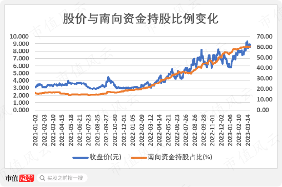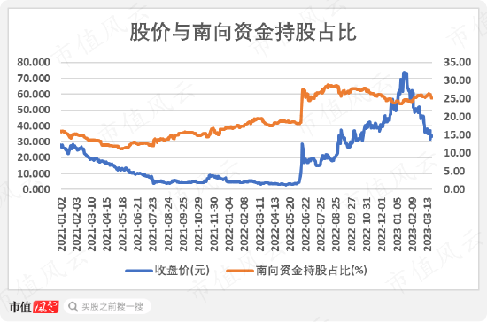 而自2021年10月起,南向资金开始加速抄底,越跌越买,持股占比从原来的9.83%,一路加仓至2023年初的51.9%,最新仍持有49.3%的股权。