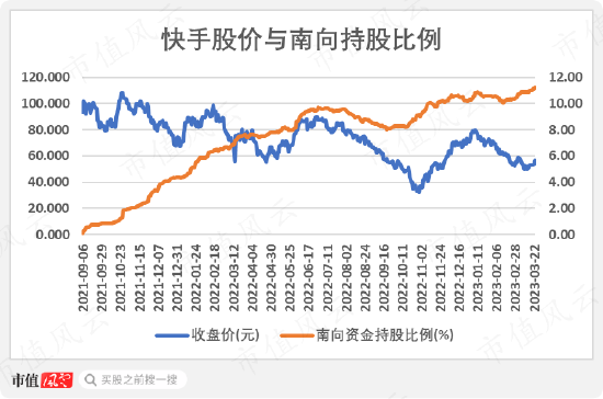 以快手-W(1024.HK)为例,在快手的股价从100元以上逐渐下跌至32元的过程中,南向资金大力支持,持股比例从0一路上升至11.2%。