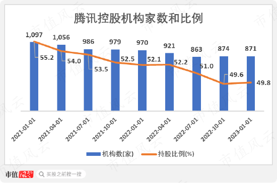 根据Choice数据显示,2021年1月1日,共有1,097家机构持有腾讯控股,持股比例高达55.2%。