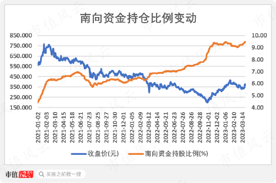 在股价下跌至350元时,南向资金开始抄底,在2022年10月跌破250元时加速抄底,股价最后在180元才触底反弹,此时持股比例已上升至8.5%,相比2021年初提高了4.1个百分点。