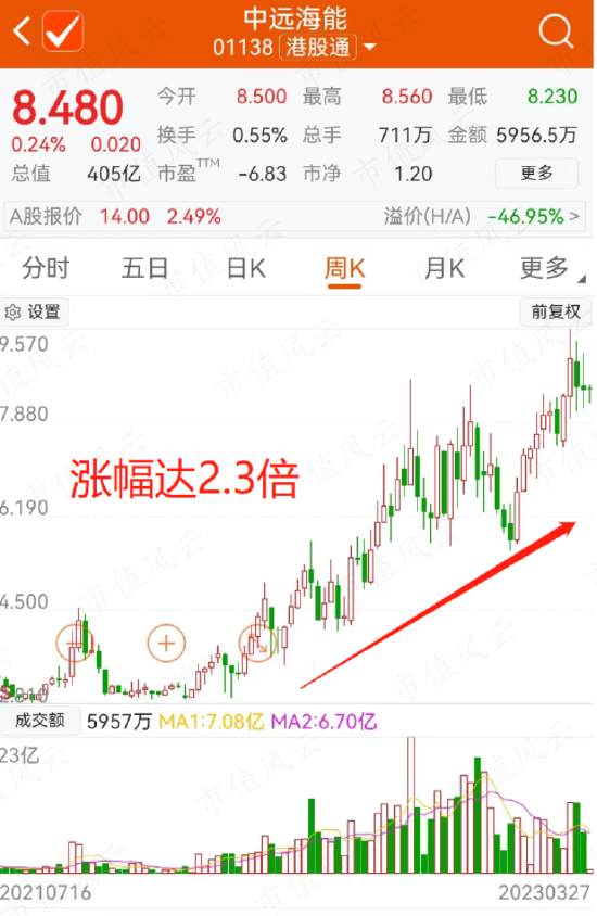 中远海能(600026.SH)同样在A股上市,而且A股的上涨幅度和速度均明显高于港股,2022年10月份就上涨至本轮行情的最高位21元/股,涨幅接近3倍。