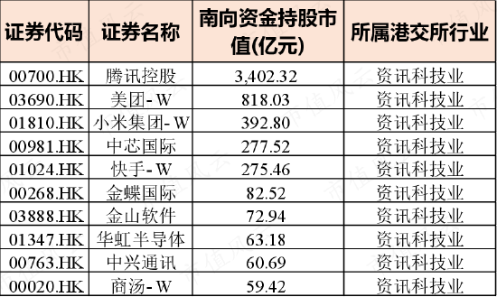 腾讯控股一家独大,南向持有市值达3,402.3亿。另有中国移动(00941.HK)、建设银行(00939.HK)和汇丰控股(00005.HK),均在千亿规模以上。