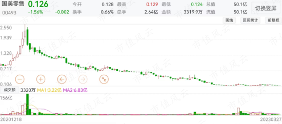 国美零售(0493.HK)在黄光裕出狱后步入漫漫熊途,从2021年2月的最高价2.55元,一直下跌至目前约0.13元,跌幅高达95%,市值仅剩51.3亿。