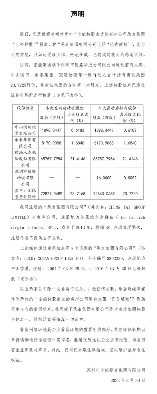 3月30日早间,宝能在官方公众号发文,称有媒体发布的“宝能持股南玻的离岸公司承泰集团‘已告解散’”为虚假信息,公司已采取法律措施,“我司旗下承泰集团有限公司作为南玻集团持股主体之一,目前运营等一切情况正常”。