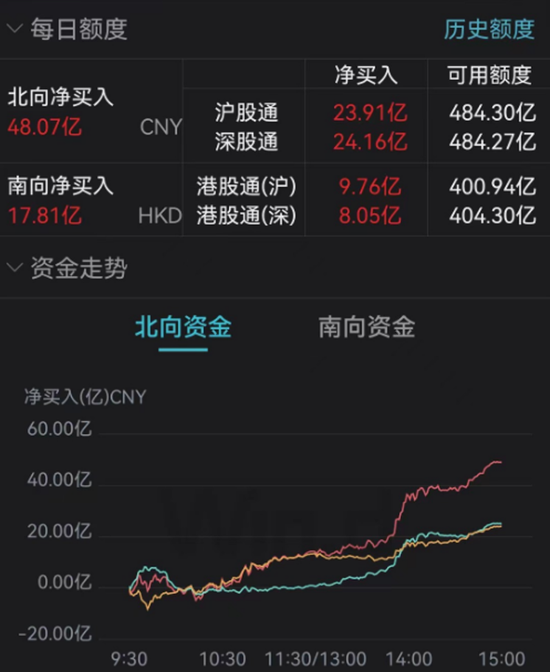 随着人民币升值,北向资金午后也加大了入场扫货的力度,全天净买入48.07亿元。其中,沪股通净买入23.91亿元,深股通净买入24.16亿元。
