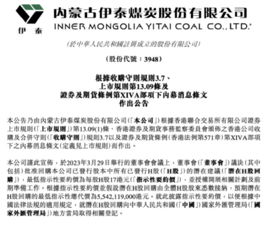 此外,伊泰煤矿公告称,议决批准回购所有已发行港股股份,最低指示性要约价为每股17港元,预期潜在回购的最低总代价为55.42亿港元。相较于,3月29日伊泰港股11.3港元的收市价有50.4%的溢价空间。3月30日,伊泰煤炭收盘报15.8港元,股价大涨39.82%。