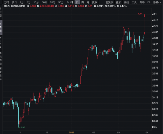 3月30日,中国石油A股、港股双双大涨。其中,港股股价大涨7.83%,A股涨6.95% ,均为2021年以来新高。同时,中国石油披露分配预案,拟派息超400亿元。