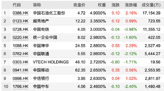 数据显示,HSHDYI权重股包括中国石油化工股份、越秀地产、中国电信、统一企业中国、中国神华、中国联通等。其中中国石油化工股份为第一大权重股。