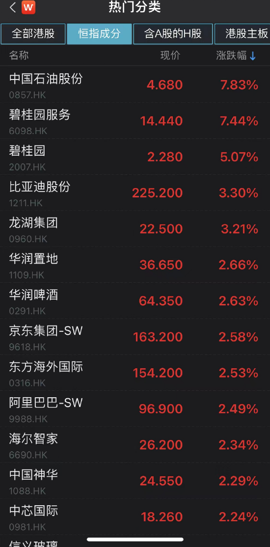 恒指成分股中,中国石油大涨7.83%拔得头筹,碧桂园服务涨7.44%,阿里巴巴-SW大涨2.49%。