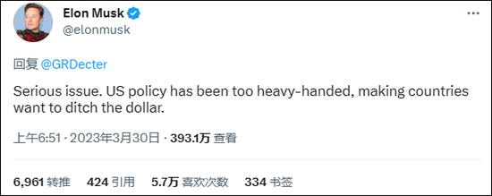 另外,当地时间3月30日,特斯拉首席执行官埃隆·马斯克(Elon Musk)在推特上发表评论称,这是一个严重的问题,美国的政策过于强硬,使得各国都想要抛弃美元。