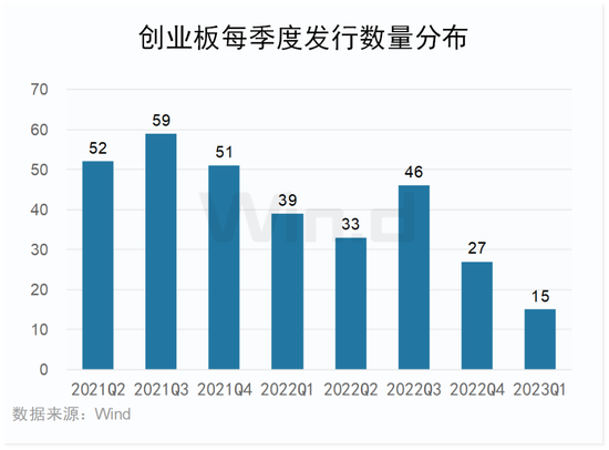 2023年一季度创业板IPO融资数量出现萎缩,共有15家成功IPO,相比去年同期的39家同比下滑了61.54%;IPO融资金额也出现回落,创业板2023年一季度合计IPO融资258.03亿元,相比去年同期的602.20亿元下滑57.15%。