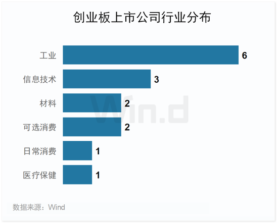 2023年一季度创业板发行的15家公司主要分布在6个Wind一级行业中,其中工业行业共发行6家公司位居第一,其次为信息技术行业,一季度发行公司数量为3家。