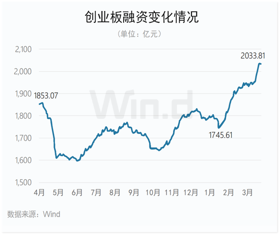 2023年以来,除了1月份受到春节假期影响有所走低外,创业板融资余额持续走高。截至2023年一季度末,创业板融资余额为2033.81亿元,较2022年末增加252.47亿元。