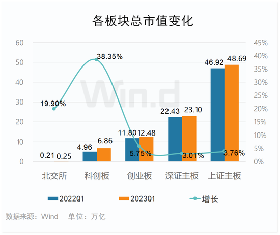 截至2023年3月31日收盘,创业板总市值为12.48万亿元,较2022年3月31日总市值11.80万亿元上升0.68万亿,总市值同比增幅为5.75%。