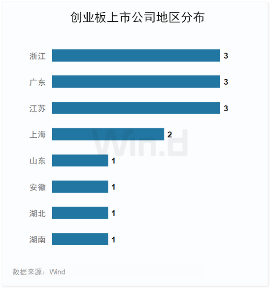 2023年一季度发行的创业板公司主要集中在浙江、广东、江苏,发行数量均为3家,上海共发行2家,山东、安徽、湖北、湖南发行数量均为1家。