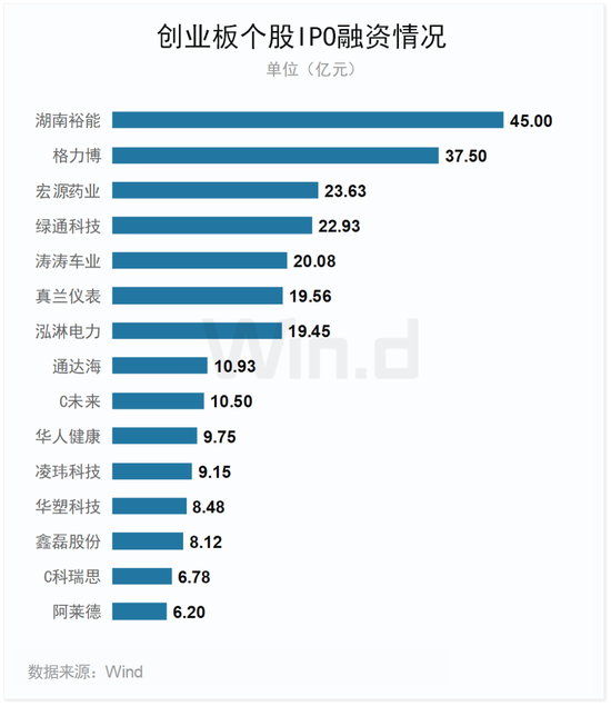 2023年一季度湖南裕能首发募资45亿元,位居创业板IPO融资榜首。此外格力博、宏源药业、绿通科技、涛涛车业IPO融资规模也较大,均在20亿以上。