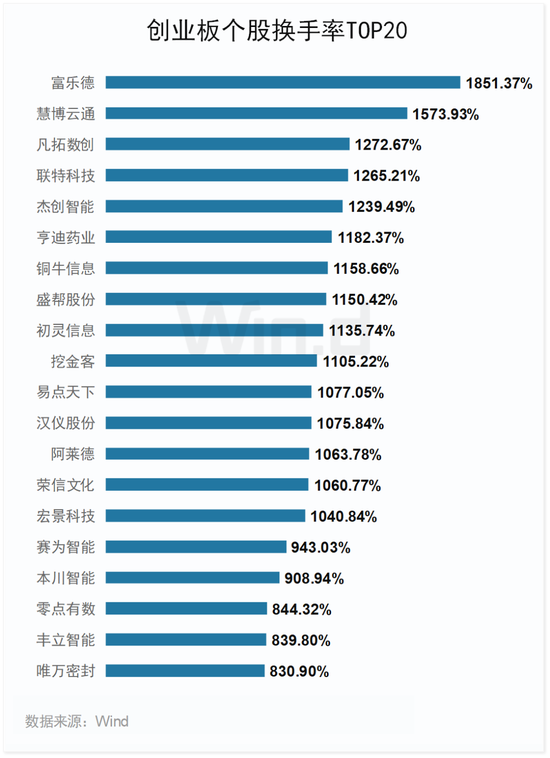 从换手率来看,2023年以来创业板资金交投活跃,一季度共15只个股换手率超10倍,富乐德换手率达1851.37%居首。