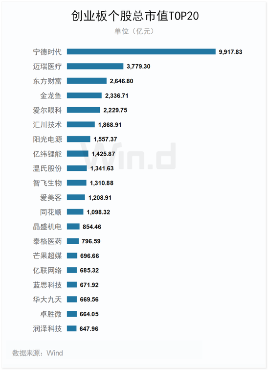 从市值表现来看,宁德时代总市值达到9917.83亿位居榜首。此外迈瑞医疗、东方财富、金龙鱼、爱尔眼科、汇川技术、阳光电源等11家公司市值均超千亿。