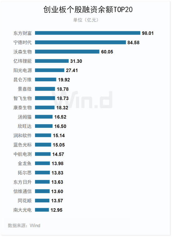 从融资余额来看,东方财富融资余额达98.01亿,稳居创业板融资余额榜榜首。此外,宁德时代、沃森生物融资余额均超过60亿,分别为84.58亿元、60.05亿元。