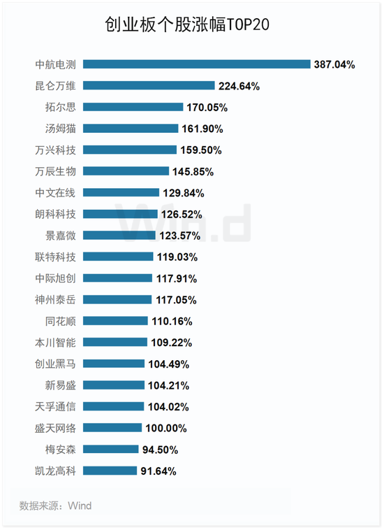 从涨跌幅来看,2023年一季度创业板个股表现良好,共1002只个股录得上涨,占比达80.35%。涨幅超100%的个股共18只,其中中航电测涨幅387.04%居首,昆仑万维、拓尔思、汤姆猫、万兴科技涨幅均超150%。
