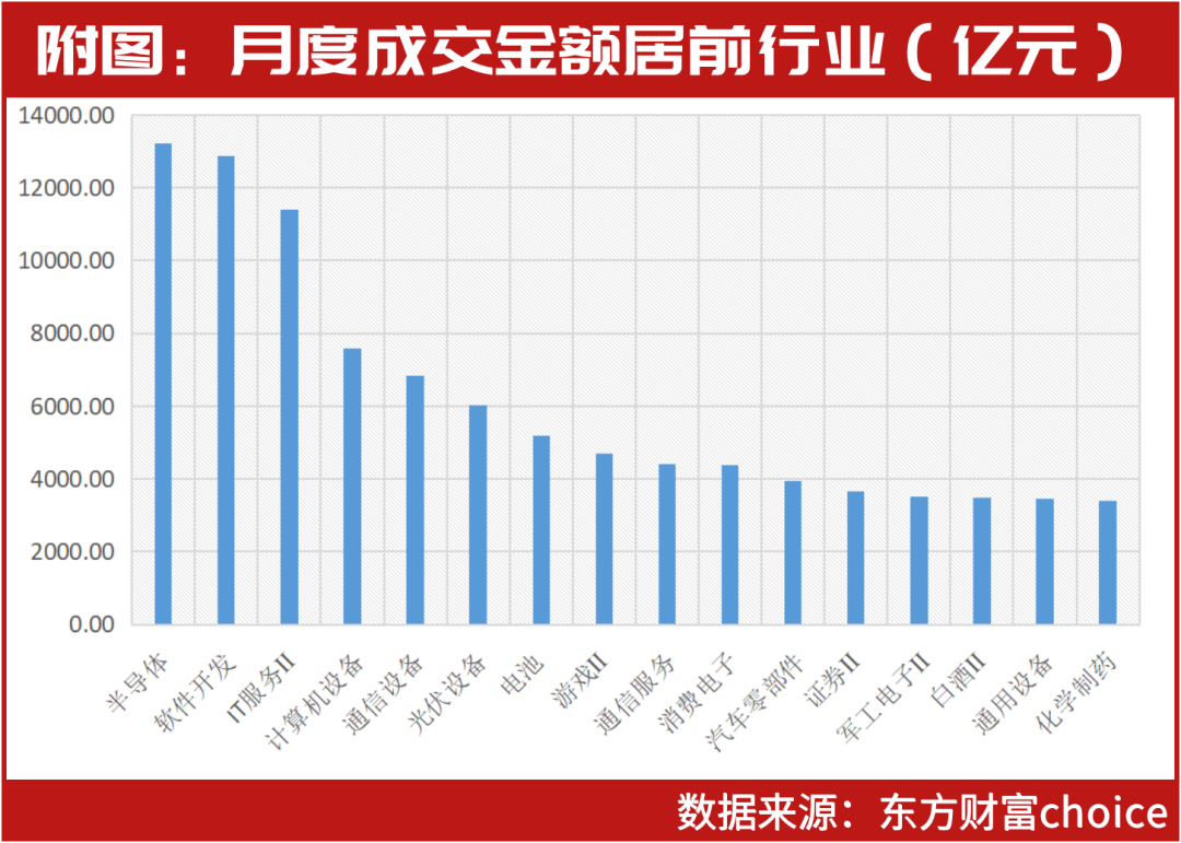 在131个申万二级行业中,半导体、软件开发、IT服务Ⅱ、计算机设备、通信设备位列成交金额前五,5个细分行业累计成交金额合计约为5.2万亿元,占3月总成交金额的24%。其中,半导体、软件开发、IT服务Ⅱ成交金额均超过万亿元(见附图)。