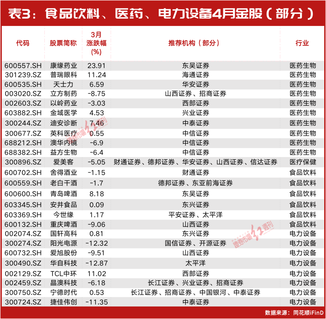 观察来看,不少标的被券商扎堆推荐,如医疗保健、医美概念股爱美客,被财通证券、德邦证券、华安证券、山西证券、信达证券等多家券商联合调入4月金股池。从推荐逻辑来看,医美线下客流持续恢复带动上游产品增加、业绩向好是券商的重点关注逻辑。