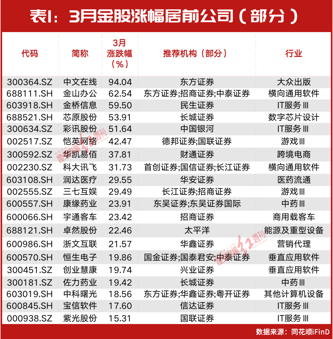 统计300余只券商推荐的3月金股,3月实现上涨的个股约为100只,涨幅超过15%的个股为22只。分行业来看,科技股占据了绝大多数席位,如中文在线、金山办公、金桥信息、芯原股份等涨幅均超过了50%(见表1)。