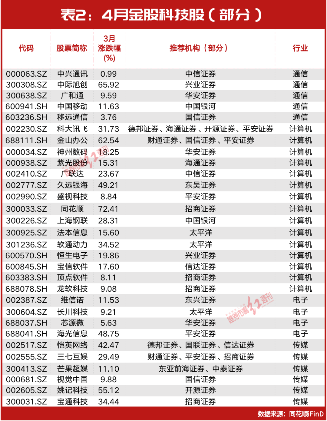回顾来看,在东方证券推荐的10只3月金股中,6只为科技股赛道,分别属于IT服务Ⅲ、垂直应用软件、电信运营商、其他计算机设备等领域。其推荐的中文在线、金山办公、中科曙光3只股涨幅居前,3月分别上涨94.04%、62.54%与18.56%。中国银河推荐的彩讯股份、中国移动涨幅居前,3月分别上涨51.64%与11.63%。