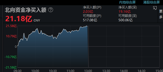 北向资金上午再度呈现净买入,半天净买入额超过21亿元。