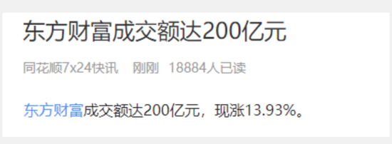 东财如此表现,也令竞争对手同花顺兴奋不已,同花顺平台盘中发布了东财成交破200亿的快讯,好一波“商业互吹”。