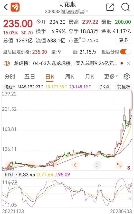 值得注意的是,近期同花顺成为该板块最靓的仔。自3月16日以来,同花顺股价从116.4元上涨至235元,短短13个交易就已翻倍。