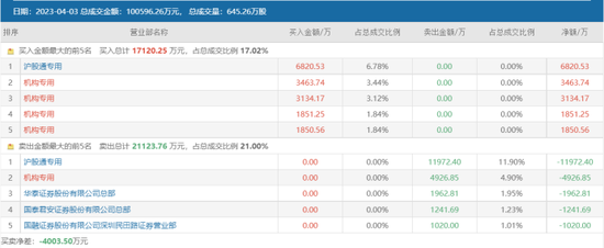 与财富趋势今日获机构同时大买大卖不同的是,板块人气龙头同花顺近日则遭北向资金和机构大幅卖出。据其4月3日龙虎榜(连续3日偏离30%)数据显示,深股通专用席位期间净卖出近4亿元,三家机构也合计净卖出近3.2亿元,游资席位中信建投杭州庆春路减持近1.4亿元。而在买入榜前五席位中,长江证券上海分公司、广发证券上海新松江路两个游资席位分别净买入近2.2亿元、0.9亿元。