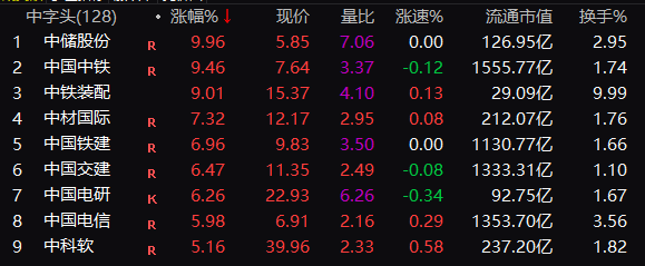 中国交建、中国铁建、中国电信等多只市值超过千亿元的中字头股票上午盘中也纷纷大涨。