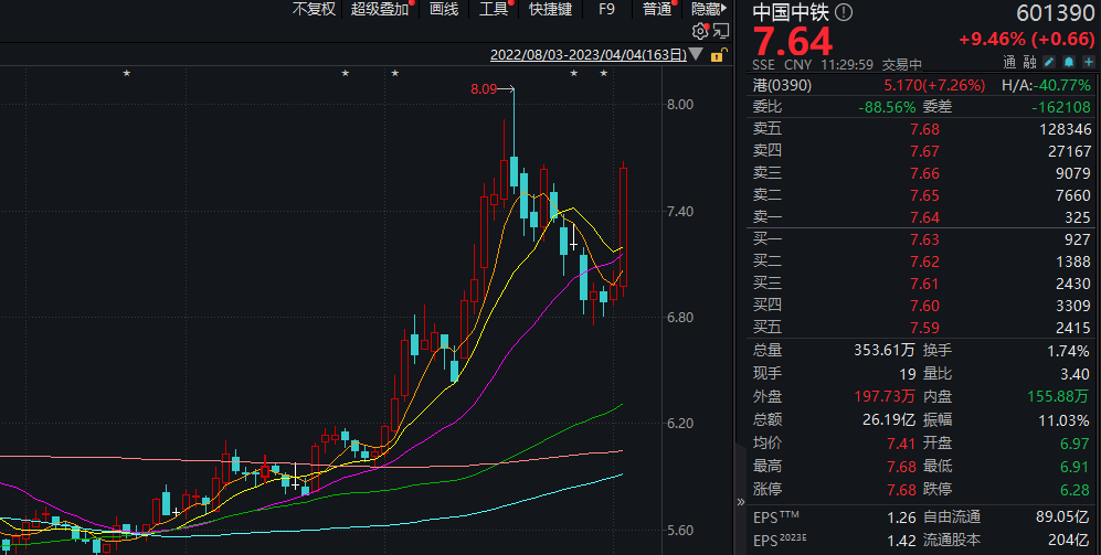 市值超过千亿元的中国中铁上午盘中一度强势冲击涨停,截至上午收盘,仍大涨9.46%,市值超过1700亿元。