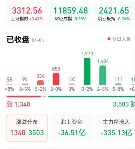 周二(4月4日),A股三大股指震荡分化。截至收盘,上证指数涨0.49%,报3312.56点;深证成指跌0.25%,报11859.48点;创业板指跌0.76%,报2421.65点。两市合计成交额13246亿元,连续第2个交易日突破万亿元;北向资金净卖出36.51亿元;总体来看,A股个股跌多涨少,其中,涨停个股达26只,跌停个股达8只。