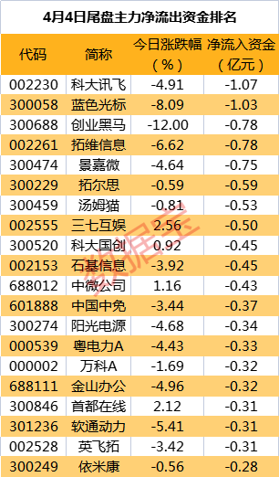 数据宝统计,科大讯飞尾盘遭主力资金净卖出1.07亿元居首;其后蓝色光标、创业黑马、拓维信息等尾盘均遭主力资金出逃超7000万元。