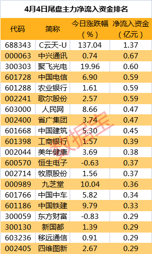 从个股看,9股尾盘净流入资金超0.4亿元。C云天-U尾盘获主力抢筹1.37亿元居前。中兴通讯、聚飞光电、中国电信紧随其后,尾盘分别净流入0.67亿元、0.6亿元、0.59亿元。