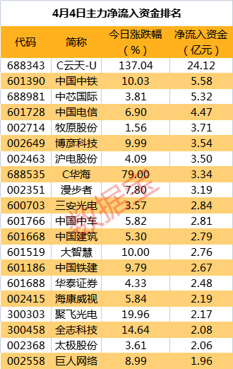 从个股来看,今日共有19股主力资金净流入超2亿元。新股C云天-U主力资金净流入24.12亿元居首,该股收盘大涨137.04%。