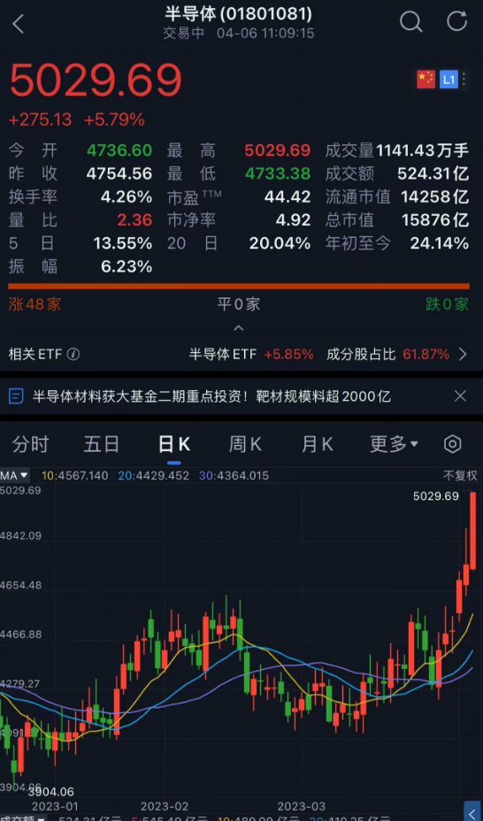 半导体板块表现亮眼,盘中振幅超6%,截至午间收盘大涨4.97%,创1年来新高,这已是该板块近期连续第6日上涨。
