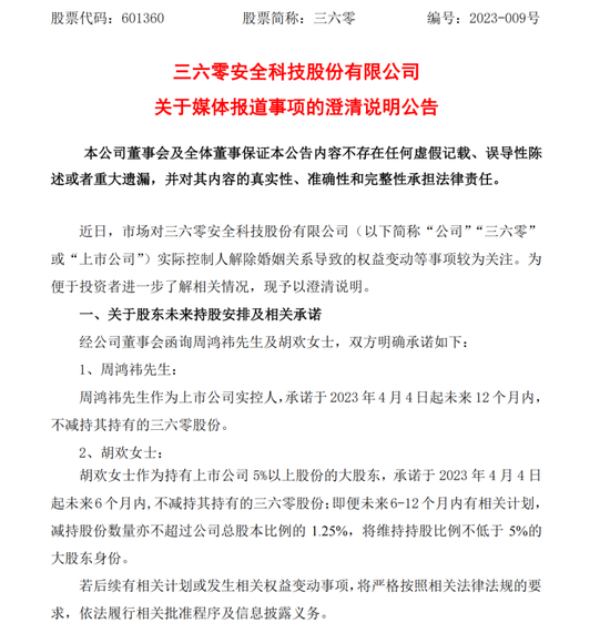 公告显示,经公司董事会函询周鸿祎先生及胡欢女士,双方明确做出承诺:周鸿祎作为上市公司实控人,明确承诺于2023年4月4日起未来12个月内,不减持其持有的三六零股份。胡欢女士作为持有上市公司5%以上股份的股东,承诺于2023年4月4日起未来6个月内,不减持其持有的三六零股份;即便未来6-12个月内有相关计划,减持股份数量亦不超过公司总股本比例的1.25%,将维持持股比例不低于5%的大股东身份。