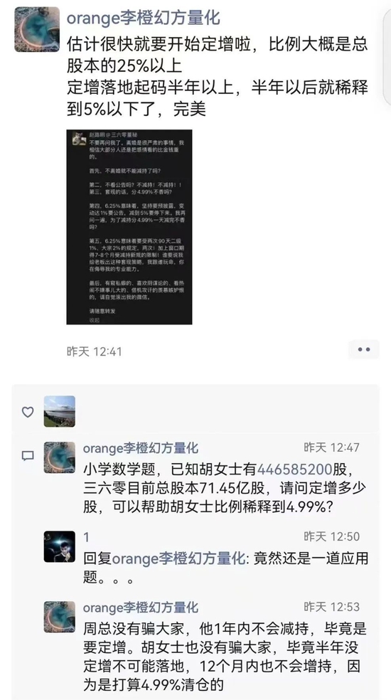 另外,4月5日,幻方量化市场总监李橙在朋友圈发文称, “( 三六零 )估计很快就要开始定增啦,比例大概是总股本的25%以上;定增落地起码半年以上,半年以后就稀释到5%以下,完美。”