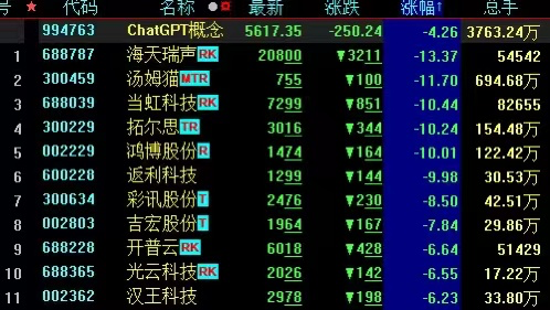 再看今天的盘面,多只AI概念个股出现大跌,很多人以为尾市还会收回来,但最终未能如愿。比如,海天瑞声大跌13%,汤姆猫大跌11%,当虹科技、拓尔思、鸿博股份、中文在线等个股,跌幅都达到10%。