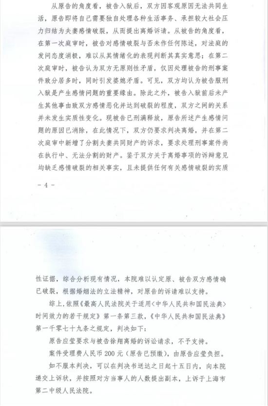 应莹称,其与徐翔曾两度表达了离婚的意愿,但法院却依然做出了夫妻感情没有破裂的判断,她将依法向上海市第二中级人民法院提起上诉。