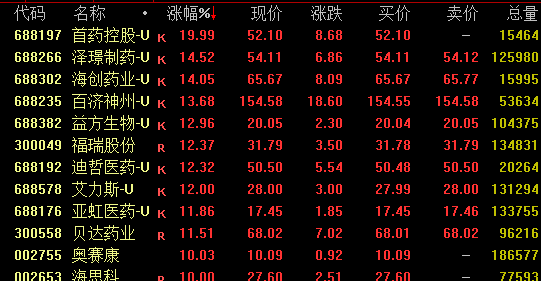 创新药概念盘中再度走强,截至收盘,首药控股“20cm”涨停,毕得医药、泽璟制药、海创药业涨超14%,百济神州、益方生物、福瑞股份、贝达药业、艾力斯等涨超10%,奥赛康、海思科涨停,凯莱英、药明康德(维权)均涨近7%。