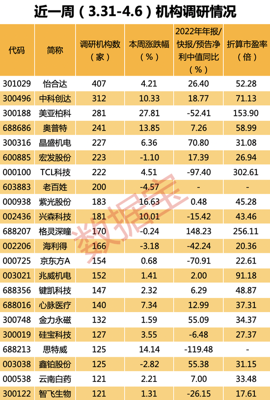 近一周机构调研个股数量有230多只,怡合达成为调研机构数量最多的股票。