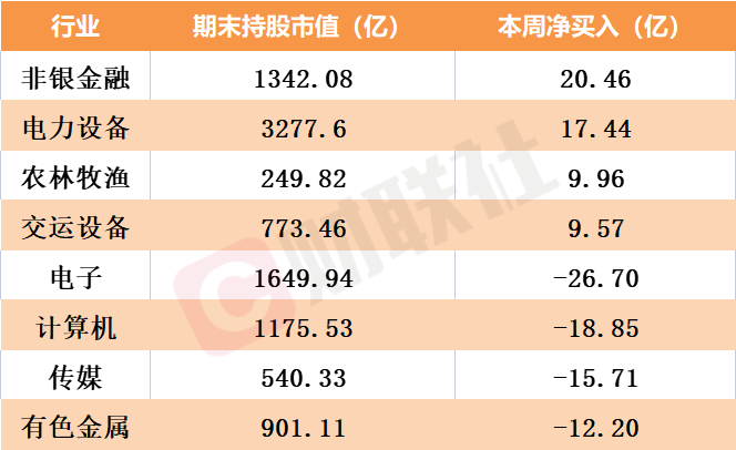 从各行业的资金流向看,非银金融为本周净买入额之最,金额达20.46亿元。电力设备、农林牧渔、交运设备整体净流入均超10亿元。电子设备抛压较重,净卖出额达26.7亿元。计算机、传媒、有色金属板块整体净卖出分别为18.85亿元、15.71亿元、12.2亿元。