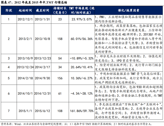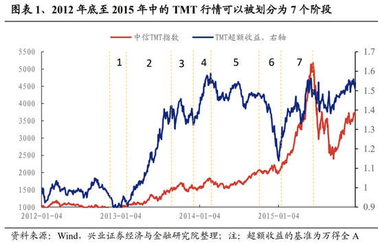 节奏上,我们将2012年底至2015年中的TMT行情划分为7个阶段: