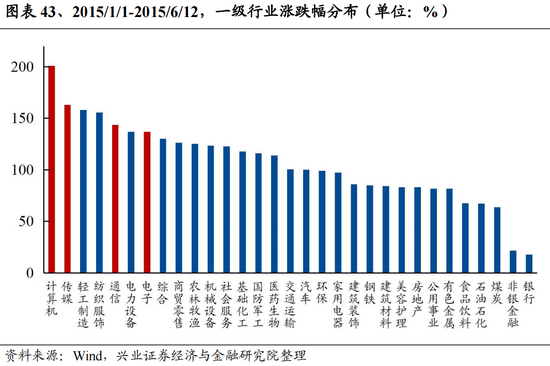 因此,2015年初市场再度上演风格切换,主线重回TMT方向。以计算机、传媒为代表的各TMT行业受到政策利好、产业趋势向好的共振催化,成为2015年1月至6月12日涨幅最高的方向。并且,在泛滥的流动性环境下,各项改革政策如火如荼地推进进一步推升了TMT估值。拆分盈利和估值的贡献来看,除计算机有一定盈利支撑外,传媒、通信和电子的涨幅几乎全部依赖于估值的大幅扩张。