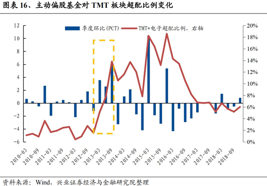 值得注意的是,尽管2013年8月TMT板块成交占比也达到高点,但行情持续向上。2013年初以来,TMT板块成交额占全部A股的比重由不足10%攀升至8月的27%以上,创下新高。但由于产业趋势的驱动和机构仓位的系统性提升(2013Q3公募对TMT板块超配比例单季度提升6.1%),景气优势和增量资金使TMT板块突破了短期情绪指标的桎梏,一直到10月中下旬以前,传媒、计算机、通信和电子依然是市场的最强主线。